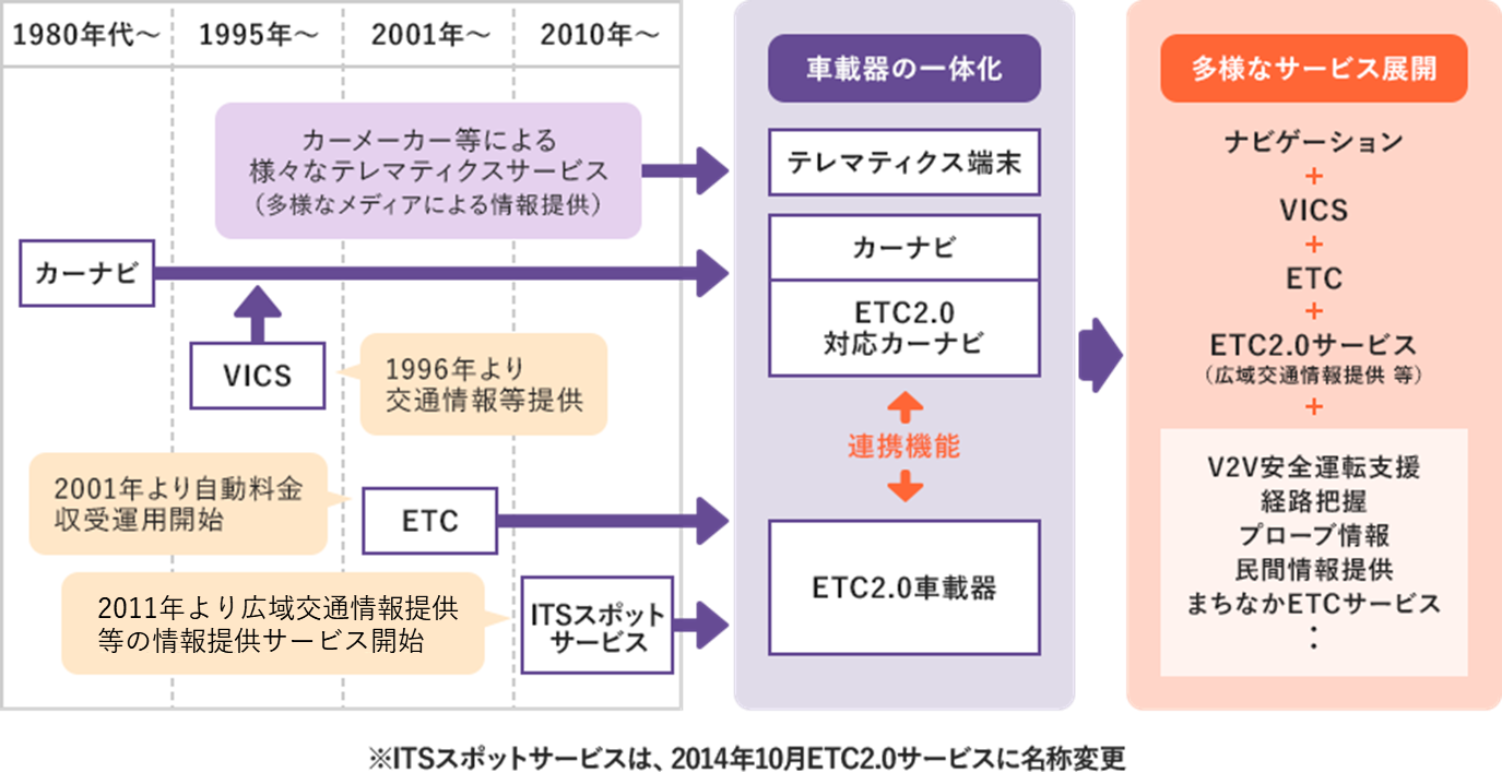 日本において、ITSサービスが広く普及している例として、カーナビゲーション、VICSによる交通情報提供、ETCによる通行料金自動収受などがあげられ、道路交通を安全・便利で快適なものとする必須の社会インフラとして広く普及しています。